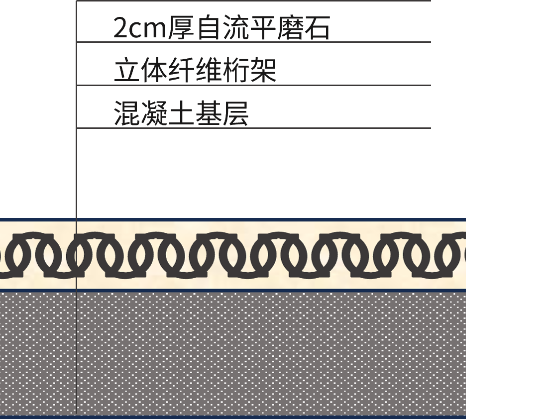 磐如石?自流平磨石地坪系統(tǒng)是兼具效率施工與可靠性能的薄層水泥基地坪系統(tǒng),采用優(yōu)化級配使材料獲得自流平特性,一次攤鋪成型,厚度20-25mm。施工中內(nèi)嵌強(qiáng)度高纖維桁架增強(qiáng)抗裂韌性,表面只需去除浮漿后直接拋光,效率對標(biāo)常規(guī)自流平。適用于高標(biāo)準(zhǔn)車間改造、商業(yè)辦公、展廳及AGV車間等對工期敏感且需兼顧美觀與耐久性的輕工業(yè)與商業(yè)場景。